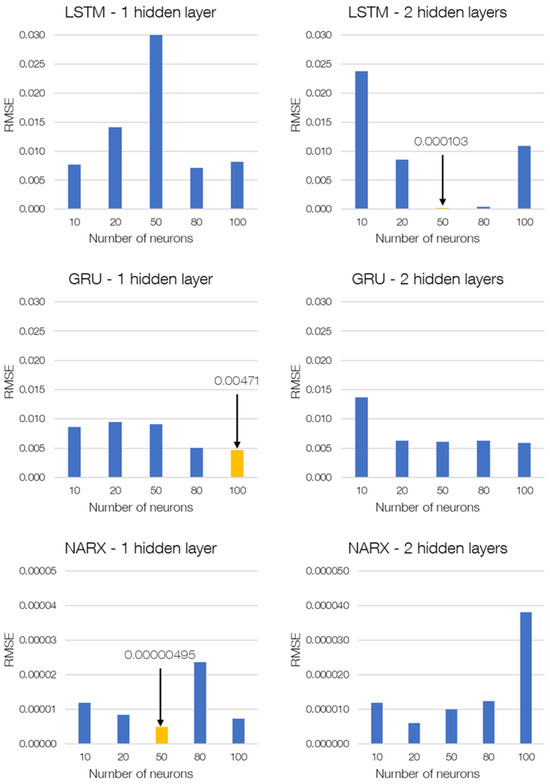 The data set was initially downsampled by a downsampling factor of 200 to accelerate convergence during training. An 80–20 data split was used, with 80% allocated to training and 20% reserved for testing. This ratio was chosen based on previous studies. Due to the early pre-screening of these models, the validation data were included for both LSTM and GRU models. Overfitting is prevented by using gradient clipping, limiting the absolute value of the gradients to 1. In the NARX model, the 80% training data set is subdivided, with 60% used for training and 20% as a validation data set. Table A2 and Table A3 in the Appendix A provide detailed information on the training parameter for LSTM, GRU, and NARX. The evaluation was based on the Root Mean Square Error (RMSE) metric for both training as well as testing error analysis. Figure 8 shows the comparison of the three RNN architectures; the complete list of RMSE values can be found in Table A1 in the Appendix A. Variants for each RNN architecture include models with a single hidden layer and two hidden layers for varying numbers of neurons. The test case results for each network are shown in Figure 8. The best results for LSTM were obtained for two hidden layers with 50 neurons in each layer. For GRU, the best results were obtained for a single hidden layer with 100 neurons, whereas for NARX, a single hidden layer with 50 neurons gave the best result. The RMSE value of the NARX model is much lower compared to LSTM and GRU, which can also be observed in the deviations, which are shown in Figure 9. The predictions from LSTM and GRU show local fluctuation, making them unsuitable for prediction of the seasonality. Additionally, the training process of the NARX network was considerably faster than the other two networks. However, due to the uncertain outcome of the comparison between different networks, the training time was not our focus and therefore not measured. Therefore, the NARX model was selected as the most promising model for further training and testing.