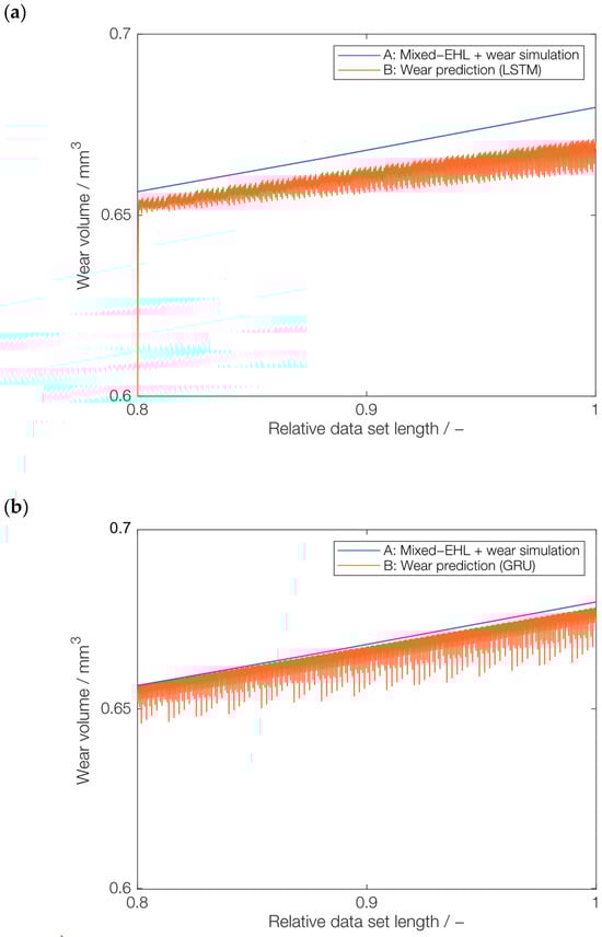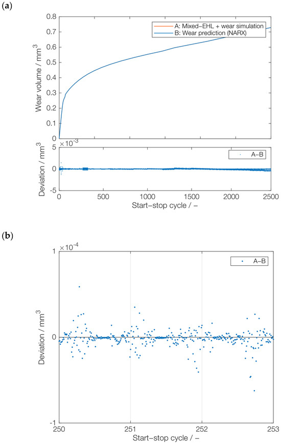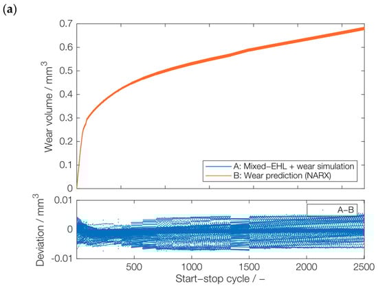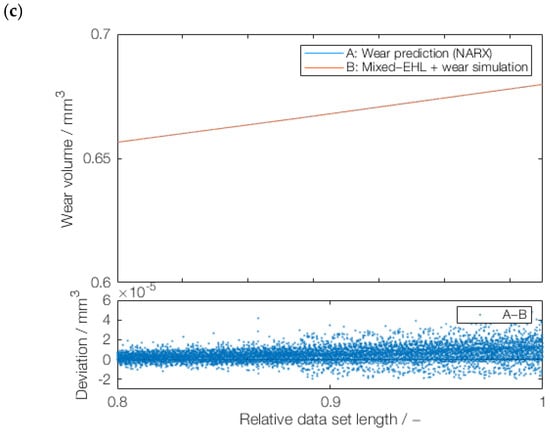 The NARX model with a single hidden layer of 50 neurons underwent training using two distinct series from the data sets Series A and Series B, featuring loads of 900 N and temperatures of 80 °C and 90 °C, respectively. The training incorporated different downsampling factors, specifically 50 and 100. Afterwards, the trained NARX model was tested with an entirely new series, Series C, without downsampling. In this case, low RMSE values were observed (0.000571). As it can be seen from Figure 11a, the prediction curve is almost identical to the wear volume curve obtained in physics-based simulations. The deviations between NARX and the coupled mixed-EHL and wear simulation are within 0.005, as shown in Figure 11b. This underscores NARX’s remarkable predictive capability in accurately forecasting unknown time series data, highlighting its potential for predictive maintenance applications in dynamic systems.