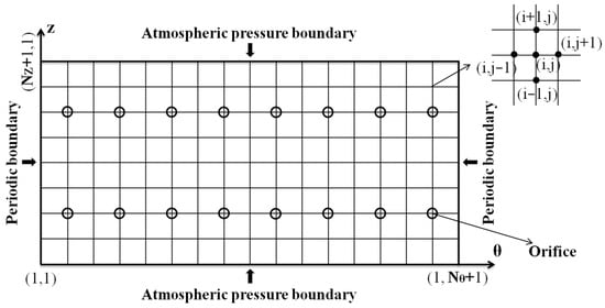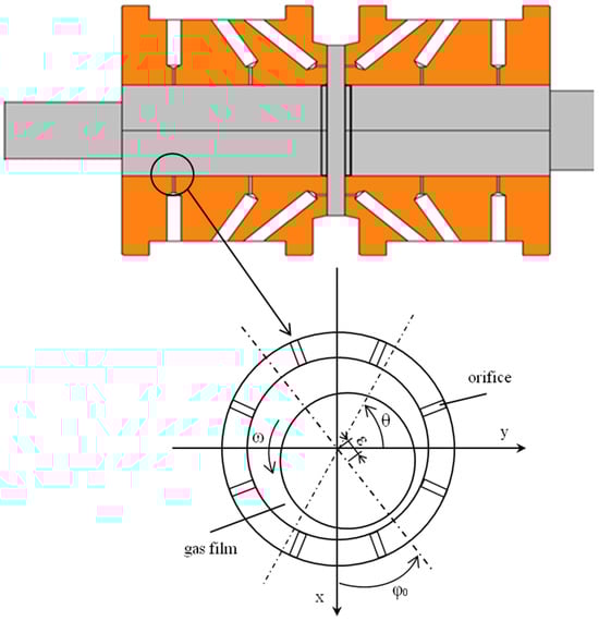 The relationship between density and pressure is given by the equation of state for ideal gases, which can be expressed as , assuming that the gas film thickness direction (the radial direction) is very small compared with the axial and circumferential geometric dimensions, which means that the change in pressure along the radial direction is ignored. The relative motion of the shaft and the bearing in the axial direction is not considered; the fluid at the gas–solid interface also meets the non-slip boundary condition. Then, Equation (1) in the cylindrical coordinate system can be simplified as follows: