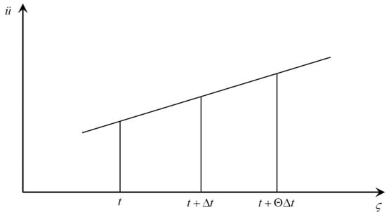 The Wilson-Θ method is used to solve the nonlinear dynamic Equation (10). It assumes a linear change in acceleration within a time interval [, ] with time variable , and , see Figure 3. With the variable Θ, the numerical stability and damping can be influenced; it has been proved that the Wilson method is unconditionally stable for [,], and the optimal value is adopted in the numerical simulation to obtain the stable prediction [].