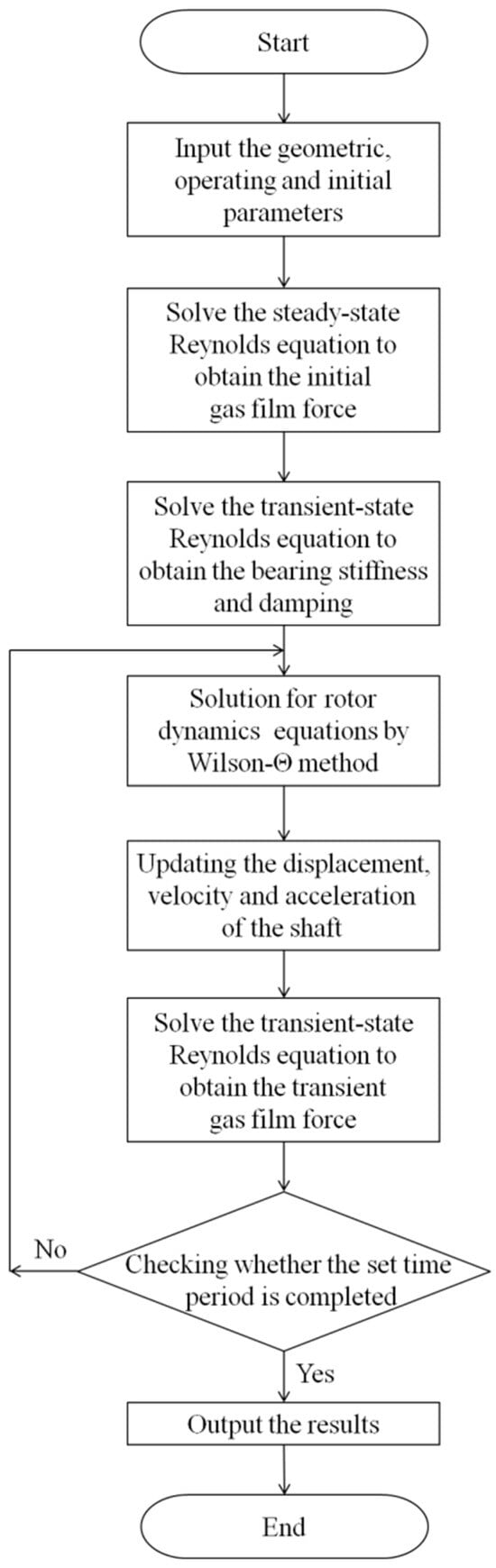 The computational process for determining the dynamic properties of the bearing–rotor system, as depicted in Figure 4, is an iterative one. It involves the Finite Difference Method (FDM) combined with a perturbation approach for the transient Reynolds equation, and the Wilson-Θ method for the rotor dynamic equation. Initially, the steady-state Reynolds equation, which disregards time (as in Equation (3)), is solved to determine the initial gas film force and the static equilibrium position, thereby establishing the initial displacement. Subsequently, the transient Reynolds equation is solved using the static gas film pressure and thickness distributions to calculate the bearing’s stiffness and damping coefficients.