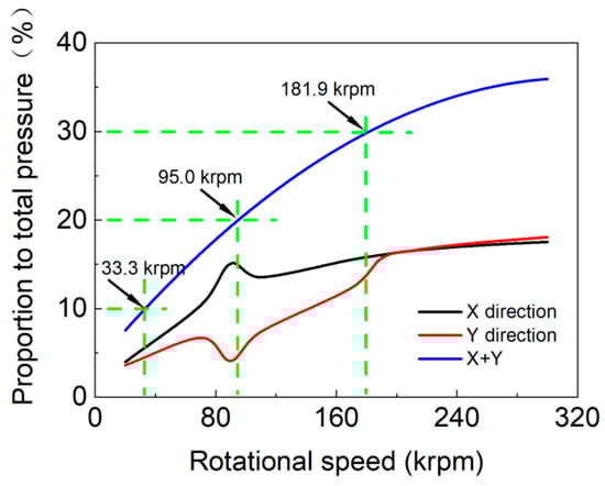 To highlight the critical role of first-order temporal variations in pressure and film thickness, as defined by Equations (7) and (8), this study meticulously computes the ratio of fluctuation components to the total transient pressure. The total transient pressure refers to the pressure value on the left side of Equation (7), which is expressed as the sum of the steady-state pressure and the pressure fluctuations. The pressure fluctuations encompass both spatial variations and temporal variations. The proportion to total pressure represents the ratio of the pressure fluctuations over the total transient pressure. Specifically, for the x-direction, this is denoted as , and for the y-direction, it is . When considering both directions, it is the sum of the pressure fluctuations in both directions divided by the total pressure, represented as . Figure 5 compellingly demonstrates that an increase in rotational velocity correlates with an escalation in the amplitude of the fluctuation terms. The rotational velocities corresponding to the fluctuation magnitudes of 10% to 30% are 33.3 krpm, 95.0 krpm, and 181.9 krpm, respectively. Specifically, once the rotational velocity exceeds 95.0 krpm (where krpm denotes 1000 revolutions per minute), the temporal pressure fluctuations constitute more than 20 percent of the overall transient pressure. Ignoring these fluctuations can result in significant discrepancies in the estimation of transient pressures, potentially undermining the accuracy of dynamic characteristic forecasts for ultra-high-speed bearing–rotor systems.