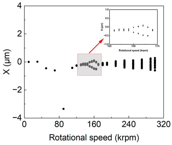 To elucidate the impact of rotational velocity on the dynamic response of the bearing–rotor system during the acceleration phase, bifurcation diagrams (Figure 6) were constructed for a range of rotor speeds from 10 to 300 krpm. This selection encompasses a spectrum of velocities designed to scrutinize the system’s orbital behavior, spectral characteristics, and Poincaré mappings.