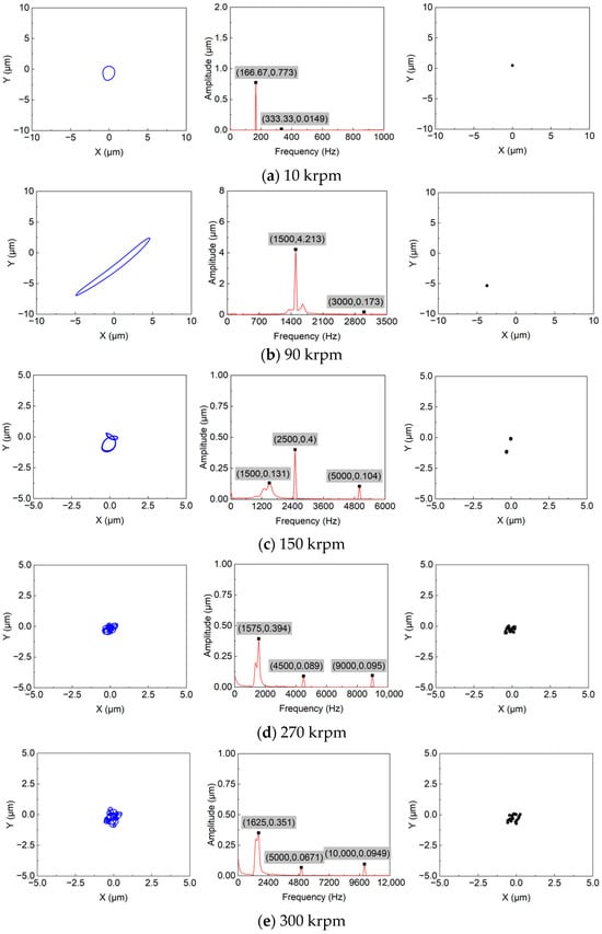 Further analysis was performed by integrating the orbit, frequency spectrum, and Poincaré map data as shown in Figure 7. In the 1T-periodic motion state, the rotor’s orbit traces a closed circular path. With an increase in rotational speed, the orbit’s complexity escalates, becoming intricately intertwined. A higher low-frequency amplitude corresponds to increased orbit complexity. The Poincaré map indicates a single point for the 1T-periodic motion state, which evolves to include two or more points as the rotational speed escalates. At 270 krpm, the points on the map exhibit chaotic behavior, losing their regular pattern, and signifying the onset of chaotic motion. At this speed, the low-frequency to 1× frequency ratio is 0.35, and the amplitude ratio is 4.427.
