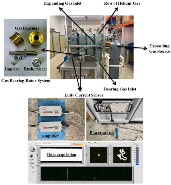 The bearing–rotor system is an essential component of cryogenic turbo-expanders, with its reliability and stability being paramount to the efficiency of cryogenic turbines. Aerostatic bearings, characterized by low friction, no oil contamination, high motion precision, and the capability to support high rotational speeds, have become prevalent in various sectors, particularly in cryogenic helium turbine applications [,,,,,]. The low temperature of the incoming medium and the substantial expansion ratio, especially in smaller capacity plants, necessitate the use of small impeller diameters and significant specific enthalpy drops in the expander. To achieve optimal insulation efficiency, high rotor speeds are required, typically ranging from hundreds of thousands to millions of revolutions per minute (rpm) []. Despite this, the dynamics of ultra-high-speed bearing–rotor systems are not well-documented in the literature.