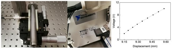 Additionally, experimental investigations are carried out to study the dynamic properties of the rotor system in a practical setup. The experimental setup mainly includes the turbo-expander, expanding gas source, bearing gas source, eddy current sensors, and data acquisition system as shown in Figure 8. The eddy current sensor is orthogonally arranged and has a measurement range of 0–400 μm. The sensor model is MICRO-EPSILON EU05, produced by MICRO-EPSILON MESSTECHNIK from Ortenburg, Germany. The maximum frequency of the displacement sensor is 20,000 Hz, the linearity is ±1 μm, and the resolution is 0.05 μm. The calibration of the distance coefficient between the measured rotor and the sensor probe is shown in Figure 9. The relationship between the voltage signal and the distance value is characterized by a proportionality coefficient of 54.3 μm per unit volt.