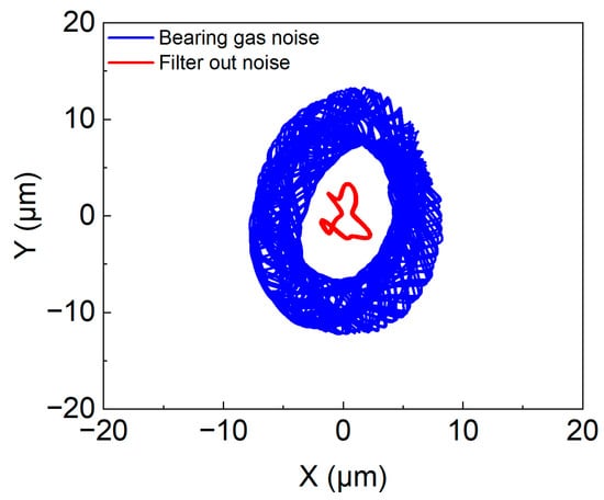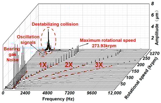 The data acquisition system is configured with a sample size of 50,000 and operates at a sampling frequency of 200,000 Hz. The experimental acceleration waterfall plot, which captures the dynamic response, is presented in Figure 10. During the initial acceleration phase, the rotor’s speed increments in a steady manner. The 1× vibration amplitude initially increases, and then diminishes, before resuming growth. Beyond a rotational speed of 250 krpm, a pronounced low-frequency vibration signal emerges. This low-frequency amplitude continues to escalate as the speed increases, until the shaft makes contact with the bearings. Below a rotational speed of 130 krpm, a vibration signal near 1000 Hz is detected, attributable to noise from the bearing gas supply. Notably, both the first critical speed of the bearing–rotor system and the noise signal from the bearing gas coincide around 1000 Hz. To assess the noise signal’s impact on the data, orbit plots were compared before and after noise filtering, as illustrated in Figure 11. The presence of the vibration signal results in a more complex and overlapping orbit, indicative of multi-periodic or quasi-periodic motion. Post signal processing to filter out the noise, the orbit is rendered more distinct and straightforward. By integrating experimental observations and noise filtration, the rotor’s authentic vibration signal is discernible. During the experiment, instability occurs when the speed hits 273.9 krpm, leading to a collision and friction between the rotor and bearings. At this unstable state, the low-frequency to 1× frequency ratio is 0.27, and the amplitude ratio is 3.112. Future research should continue with the acceleration experiment, with a focus on mitigating the noise from the bearing gas supply.