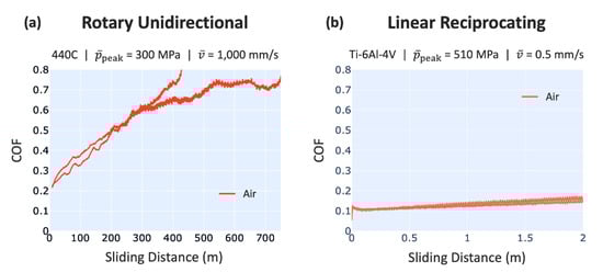 Coefficient of friction as a function of sliding distance in an ambient atmosphere: (a) rotary unidirectional tests on Microseal 200-1-coated 440C and (b) linear reciprocating tests on Microseal 200-1-coated anodized Ti-6Al-4V, as performed by Vellore et al. [].