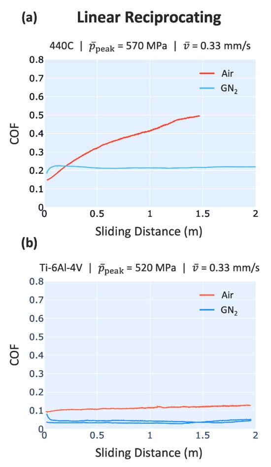 Comparative frictional analysis from unidirectional tests at (a) lower pressure and higher speed or (b) higher pressure and lower speed on Microseal 200-1-coated 440C stainless steel and Microseal 200-1-coated anodized Ti-6Al-4V alloy in air (red) and GN2 (blue). The data are consistent with results from the linear reciprocating tests, confirming the difference in frictional performance between substrates and environmental conditions.