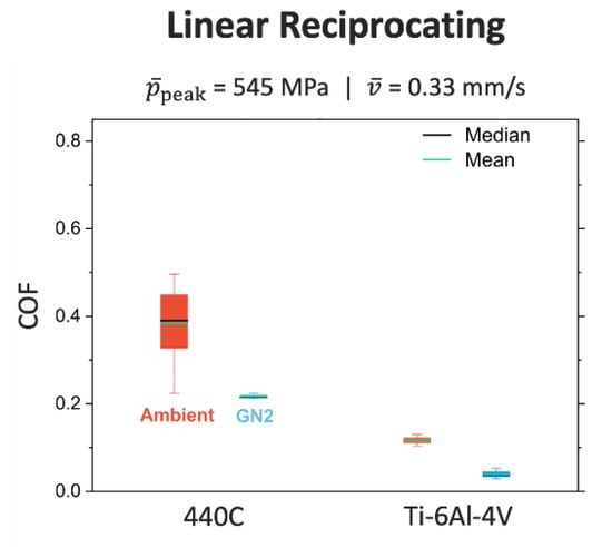 Summarized friction coefficients from linear reciprocating tests on Microseal 200-1-coated 440C stainless steel and anodized Ti-6Al-4V alloy in air (red) and GN2 (blue). The box plots highlight the relative performance across substrates and environments.
