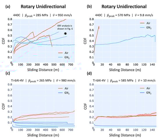 Initially, we reevaluated the results of tests on Microseal 200-1 presented in a previous study by Vellore et al., who reported the data only, i.e., they have not yet been fully analyzed []. The processed data, shown in Figure 1, reveals distinct friction behaviors between the two different substrate materials. Notably, the COF in the rotary unidirectional tests on Microseal 200-1 coated 440C was significantly higher than that in the linear reciprocating tests on Microseal 200-1 coated anodized Ti-6Al-4V. Also, while the COF was relatively stable during the Ti-6Al-4V tests, the friction started to increase after approximately 7.5 m of sliding in the 440C tests. Further, the relative motion and load/speed conditions differed between the tests on the two substrates, making a direct comparison of the substrates difficult.