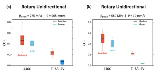 To ensure that our findings were not specific to linear reciprocating motion, we also conducted rotary unidirectional sliding tests on the same Microseal 200-1-coated substrate materials. The results from these rotary unidirectional tests are displayed in Figure 4. Figure 5 consolidates the findings in a box plot format to facilitate comparison. Conducted at two different contact pressure and speed conditions, the data indicate a minor pressure/speed dependence within the tested range where the mean COF is slightly higher at lower pressures and faster speeds. There is also more variation in the data at the lower pressures and faster speeds, likely attributable to non-flatness of the disk samples (the top and bottom of the disks not perfectly parallel) which affects friction more under those conditions. Overall, the results mirrored the linear reciprocating data, showing a lower COF in GN2 for both substrates and a more stable and lower COF for the titanium alloy compared to the 440C substrate.