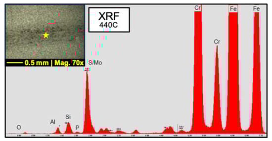 An XRF analysis was conducted on one of the wear tracks after a cumulative sliding distance of approximately 691 m to verify the coating’s persistence throughout the test. This test was performed on a DFL-coated 440C coupon, which underwent unidirectional testing in a GN2 atmosphere at a 285 MPa load and a 950 mm/s sliding speed. The upper left inset of Figure 6 is an optical microscope image of the wear track suggesting partial wear-off of the coating during testing. This observation aligns with the high friction coefficient exhibited by the corresponding friction trace in the upper left panel of Figure 4, implying DFL failure. XRF was performed in the area marked by a yellow star in the wear track image in the inset of Figure 6. The XRF data confirm the presence of MoS2 in the wear track for the entirety of the test. Additionally, the XRF analysis indicates elevated levels of chromium and iron, which are attributable to wear of either the ball or the 440C substrate following DFL failure; the latter explanation is supported by the patchy appearance of the wear scar in the inset in Figure 6.