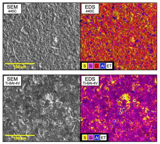Further microscopy on untested coatings was performed to understand the substrate-dependent performance of Microseal 200-1. SEM and EDS images of the untested coatings, presented in Figure 7, were acquired to characterize the morphology and chemical composition of the DFL-coated surfaces. The EDS map shown in Figure 7 reveals the presence of sulfur (from the MoS2), along with aluminum and silicon. The presence of aluminum is attributed to residual alumina impurities from grit blasting performed on the substrate prior to DFL application. The presence of silicon may be due to the silicate in the inorganic binder used in the Microseal 200-1 deposition. In the case of the Ti-6Al-4V alloy, the notable presence of silicon in the bottom right panel of Figure 7 (in pink) may also be attributable to the anodizing process, which forms a layer composed of Ti oxides and Si oxides.