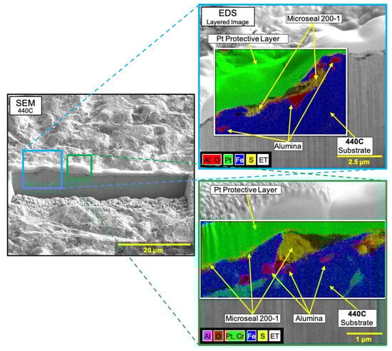 The SEM images in Figure 7 show rough surfaces for both 440C and Ti-6Al-4V substrates, with undulations on the order of tens of microns. FIB-cut cross-sections of the coatings provided additional information about the distribution of Microseal 200-1 coating thickness and composition on both substrates, with SEM and SEM/EDS overlays. The results are shown in Figure 8 and Figure 9, for 440C and anodized Ti-6Al-4V substrates, respectively. Comparison of the SEM images in the left panels in Figure 8 and Figure 9 indicates that 440C has a more irregular surface than Ti-6Al-4V. This surface roughness could partly explain Microseal 200-1’s overall higher than expected friction and, particularly, its poorer performance on 440C compared to Ti-6Al-4V.