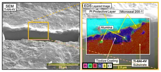 The SEM/EDS overlays in the right images of Figure 8 and Figure 9 enable a comparison of the compositions of the coatings on the two different substrates. Notably, aluminum is present in both coatings, highlighted in red and pink in Figure 8 and green in Figure 9, with a significant amount of silicon detected in the coating on the Ti-6Al-4V substrate (shown in blue in Figure 9) attributed to the anodized layer and/or silicate binder. On both substrates, Microseal 200-1 appears as pockets of sulfur, depicted in yellow in the SEM/EDS overlays of the FIB-cut sections.