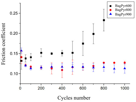 Evolution of the friction coefficient as a function of cycles number for biochars obtained from sugar cane bagasse at pyrolysis temperatures of 600 °C (BagPyr600), 800 °C (BagPyr800) and 900 °C (BagPyr900).