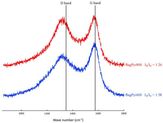 In order to explain the beneficial effect of the increase in the pyrolysis temperature on the friction performances of the biochars, the structures of the compounds have to be considered. Figure 2 shows the Raman spectra recorded on the initial BagPyr600 and BagPyr800 particles. The spectra exhibit the characteristic D and G bands associated with the presence of graphitic domains. The G band (1580 cm−1) is attributed to the E2g vibration mode of the graphitic lattice, while the D band (1350 cm−1) is associated with disorder [32,33]. The determination of the relative intensities of the D and G bands (ID/IG ratio) allows for us to point out the structural evolution of the biochar with the increase in the pyrolysis temperature. The ID/IG ratios of the BagPyr600 and BagPyr800 samples are, respectively, equal to 1.58 ± 0.01 and 1.26 ± 0.01. As expected and already observed for carbon materials, the increase in the pyrolysis temperature leads to a decrease in structural disorder and, in consequence, to an improvement of the friction properties.