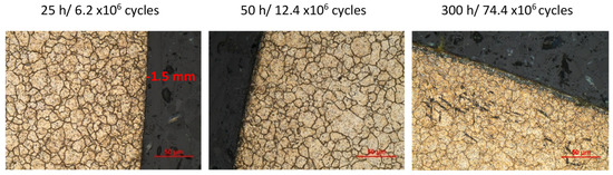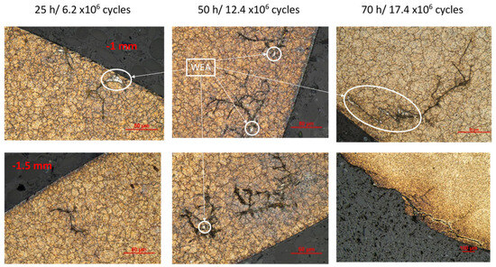 In Figure 5, microsections of selected bearing rollers are shown after different testing durations. The distance to the outer edge of the roller is shown (in mm) in the images below. Independent of the runtime, at a distance of 0.5 mm from the outer edge, no damage can be identified. With the low-ref oil, a slight subsurface damage can be found after just 25 h of runtime. At a 1 mm axial distance, the first signs of damage appeared 10 to 50 µm below the surface after a test duration of 25 h. In contrast to these results, severe subsurface damages occurred after a 50 h runtime. After 50 h, severe propagation of the material cracks were observed in the subsurface region up to 200 µm under the surface. Also, WEC was found in these samples, although there was no damage visible on the contact surface. After approximately 70 h, the bearing rollers failed and showed severe flaking damage on the surface. There were large areas exhibiting WEAs, which were surrounded by long networks of cracks. At 1.5 mm to the outer edge of the roller, there were also some subsurface cracks after only a 25 h runtime, with severe damage occurring in this region after a longer runtime. After 70 h, the rollers showed flaking damage on the surface. Due to the chipped off surface and subsurface region, the number of observed WECs and WEAs was lower than that noted in the test at 50 h. However, subsurface damage was still found in the damaged samples.