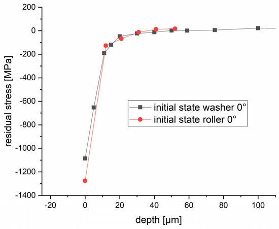 The residual stresses were measured on the washers. The flat surface of the washer ensures better repeatability of the measurements, which would be otherwise affected by the crown of the roller (cylindrical rollers are actually manufactured with a slight camber that is subject to manufacturing tolerances). Nevertheless, to ensure transferability of residual stress results between the roller and washer, comparison measurements were carried out on virgin samples, as shown in Figure 7. The stress profiles obtained from the washer and the roller indicate very close results.