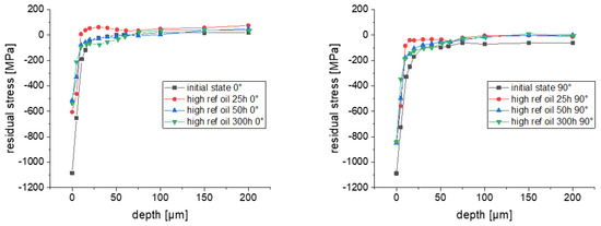 Residual stress profile of tests using high ref oil after 25 h, 50 h, and 300 h, measured in the rolling direction (left) and perpendicular to the rolling direction (right).