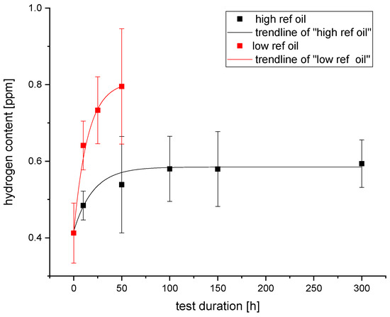 The measurement of hydrogen content using the TDA (Figure 10) shows the difference in the hydrogen accumulation in the bearing rollers using the different lubricants and test durations. The test runs using low ref oil showed a higher hydrogen content in the samples. The samples tested using high ref oil showed the maximum hydrogen content of 0.6 ppm, reached after approximately 100 h. Longer test durations did not result in higher hydrogen content in the samples. These runtimes were not even achieved with the low-ref oil due to the occurrence of damage. After a 25 h runtime, a hydrogen content over 0.6 ppm was measured, and after 50 h, an average of 0.8 ppm was measured in the roller samples. A measurement showing very high hydrogen content was obtained from a sample tested for 70 h with the low-ref oil; nevertheless, it was not shown on this graph. The cross-sectional analysis of the 70 h test run showed a network of cracks that propagated to the surface of the rollers. Thus, even after grinding the superficial area of the rollers, some lubricant might have been trapped in deeper cracks, which would have affect the measured hydrogen content.