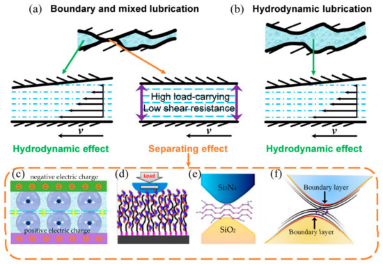 Reducing the friction loss between two sliding surfaces has become a cutting-edge topic in the field of tribology [40,41]. Over the years, many scholars have focused on studying lubrication mechanisms (Figure 2) to reduce the coefficient of friction and minimize material losses under water-related lubrication. Zhang et al. summarized a decade of research on liquid superlubricating materials, categorizing them into five groups: water- and acid-based solutions, hydrated materials, ionic liquids (ILs), two-dimensional (2D) materials as lubricant additives, and oil-based lubricants. They demonstrated how hydrodynamics and hydration contribute to achieving liquid super lubrication [42]. Han et al. demonstrated in their research that macroscopic superlubricity can be achieved using hydrated ions (cations and anions) between Si3N4 (silicon nitride) balls and sapphire disks, even under high contact pressure [6,43,44,45,46]. These findings indicate that hydration, derived from the hydration layer structure, along with the tribochemical boundary layer, which is easy to shear, both contribute to providing an excellent boundary lubrication performance [47,48]. Due to water’s poor film-forming ability, Luo et al. investigated the lubricating effect of self-emulsifying esters (SEEs) and other components on the surface of a titanium alloy (TB6) using a high-frequency reciprocating linear vibration machine. The results showed that SEEs can significantly enhance the film-forming ability of aqueous solutions, and the combination of SEEs and phosphate ester in an aqueous solution can provide effective lubrication for the titanium alloy [49]. Changing the ionic potential can also help reduce the coefficient of friction. Gao et al. proposed a method to achieve a very low friction state by applying an external potential. A particular anionic surfactant solution, when subjected to a distinctively applied negative potential, was found to induce an exceedingly low friction condition on the surface of gold. This discovery revealed a unique interaction phenomenon between the surfactant solution and the gold surface under the influence of the applied potential. As the duration of the applied negative potential increased, the friction decreased from 8.3 to 3.5 × 10−2 N, representing a reduction of 99.6%. The final coefficient of friction could be lowered to 3 × 10−4 [50]. Wang et al. synthesized P (MPC-co-SBMA) copolymerized hydrogels using two amphiphilic ionic polymers: 2-methacryloyloxyethyl phosphorylcholine (MPC) and sulfobetaine methacrylate (SBMA). When the copolymerized hydrogel hemisphere was combined with sulfide water, a superlubricated state with a friction coefficient of about 0.002 was achieved. These findings offer new insights into the mechanism of superlubrication in amphiphilic hydrogels based on the hydration effect and suggest potential applications for artificial joint cartilage [51]. Advances in lubrication research are placing greater demands on biotechnology research focused on polymeric materials [52,53,54].