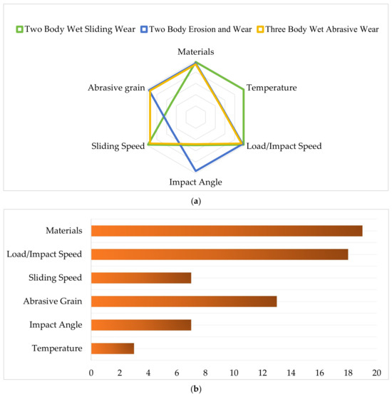 Wear research involves a multidisciplinary approach, utilizing a range of techniques including theoretical analysis, simulation, experimental testing, and characterization analysis. In this chapter, within the context of the experimental investigation, the influences of six distinct factors on the tribological characteristics of polymeric materials are comprehensively outlined. This study covers three principal wear mechanisms: two-body wet sliding wear, two-body erosive wear, and three-body wet abrasive wear. Figure 3a illustrates the distribution of the main factors influencing the three wear mechanisms discussed in this review. Meanwhile, Figure 3b provides a summary of the number of literature sources addressing these wear forms.