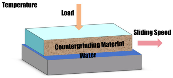 In two-body wet sliding wear (Figure 4), the wear behavior of polymeric materials is primarily influenced by factors such as the polymer material [55], the load applied to the grinding pairs [56,57,58], the sliding speed between the grinding pairs [59,60,61], and the temperature at which the grinding pairs are exposed [26,62]. In a water environment, the wear behavior differs from that under other lubrication conditions, and some scholars have explored the underlying mechanisms of this behavior.
