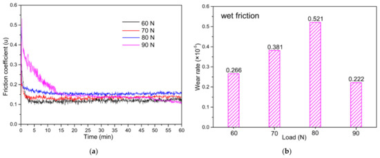 (a) Time dependence of friction coefficients for different working loads under wet friction conditions; (b) results of wear rate for different working loads in wet conditions [71].