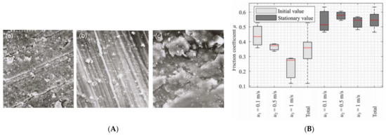 (A) SEM photo of the worn surface of the rubber during water lubrication: (a) 720 r/min, (b) 1440 r/min, and (c) 360 r/min [74]; (B) the influence of different relative velocities on the friction coefficients, μ, of the initial value and stationary value [53].
