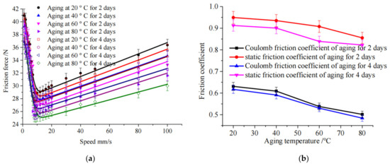 (a) Effect of aging temperature on friction force; (b) friction coefficients under different temperatures [74].