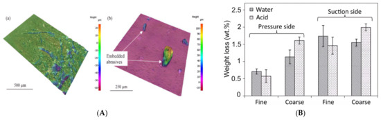 In the erosion wear experiment, the size of abrasive particles directly affected the effect of surface erosion. Ojala et al. conducted tests on natural rubber and polyurethane lining materials, using a wide range of particle sizes, ranging from coarse 8/10 mm granite particles to finer 0.1/0.6 mm quartz particles. A 3D profilometer image of the elastomer wear surface is provided in Figure 11A. This study found that, in general, elastomers exhibited a better wear performance, with a reduction in the wear loss of 40–95% when edge wear was suppressed. This indicates that both large and fine elastomers are effective in minimizing wear when abrasive particles do not cause significant edge damage. However, as the size of the abrasive particles increased, edge wear became more pronounced, leading to greater material loss at the edges. Additionally, with larger particles, the phenomenon of particle nesting decreased, meaning that larger particles were less likely to embed in the elastomer surface, potentially leading to more extensive wear in those regions. These findings suggest that controlling the size of abrasive particles and minimizing edge wear are key strategies for enhancing the durability of elastomer linings in abrasive environments [91]. Suihkonen et al. explored the erosive wear characteristics of glass fiber-reinforced vinyl composites (FRPs) in slurries containing different abrasive grain sizes. These tests were conducted in high-temperature water and acidic environments to simulate challenging operating conditions. This study found that, when the abrasive material was changed from fine quartz (50–200 μm) to coarse quartz (100–600 μm), there was a significant increase in the polymeric material’s volume loss on the pressure-bearing surface, which rose from 0.7% to 1.2% by weight. Conversely, on the suction side of the material, the volume loss decreased from 1.75% to 1.5% by weight. This data are depicted in Figure 11B. These findings suggest that larger abrasive particles contribute to greater erosion on the pressure-bearing surface, likely due to their increased impact force and the resulting material displacement. However, the reduction in volume loss on the suction side with coarser particles indicates a complex interaction between the abrasive size and the wear mechanisms, where finer particles may cause more significant material removal from certain areas due to factors like particle nesting or different erosion dynamics [92].
