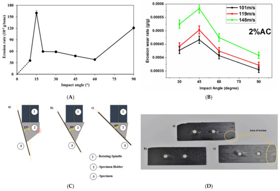 Pankaj et al. fabricated hybrid polymer composites reinforced with glass and steel fibers, incorporating varying weight percentages, using the vacuum-assisted resin transfer molding (VARTM) method. Their study focused on investigating the steady-state slurry scour properties of these composites, specifically analyzing the erosion behavior at different impact angles within a slurry scour environment. The results revealed that the peak erosion rate occurred at impact angles ranging from 45° to 75°, while keeping all other variables constant. This indicates that the composites are most vulnerable to erosion within this specific range of impact angles, where the combination of abrasive particles and impact force leads to maximum material removal. This study underscores the importance of understanding how the impact angle influences erosion in hybrid polymer composites, which is crucial for optimizing their performance and durability in environments where they are exposed to slurry and similar abrasive conditions [94]. Prakash et al. investigated the erosion and abrasive wear properties of porous nano-activated carbon epoxy composites. The erosion wear rate was examined under different impact angles, with the most significant change observed in composites containing 2% activated carbon. The results indicated that all the composites exhibited semi-ductile erosive wear behavior, with the highest wear rate occurring at a 45° impact angle, as shown in Figure 12B [97]. Panchal et al. investigated the erosive wear properties of epoxy composites reinforced with uncooked and cooked eggshell fillers. This study evaluated the erosive wear behavior in mineral water conditions at various impact angles, including 30°, 45°, 60°, and 90°, to determine their specific effects. The results showed that the highest erosion rate occurred at a 60° impact angle [98].