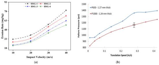 (a) Plot of slurry erosion rate with reference to the impact velocity for all fabricated hybrid glass/steel fiber epoxy composites [94]; (b) failure pressure versus translation speed [101].