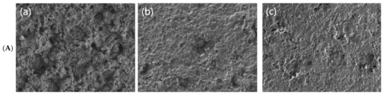 The influence of polymeric materials is a significant factor in three-body abrasive wear, as demonstrated by the study conducted by Song et al. They investigated the abrasive wear behavior of nitrile butadiene rubber (NBR) with varying acrylonitrile mass fractions (18%, 26%, and 41%) after immersion in deionized water, using a ring–block micro-controlled testing machine. The results indicated that increasing the acrylonitrile content in the Buna-N rubber led to an increase in hardness (Shore A) from 62 to 73. Additionally, the friction coefficient of the dissolved material decreased from 0.787 to 0.504 when subjected to spherical abrasive particles. This reduction in the friction coefficient was accompanied by a decrease in the wear quality change (Qwc), from 17.6% to 9.7%, demonstrating enhanced abrasion resistance. This study, visualized in the SEM diagram shown in Figure 15A, highlights how modifying the polymer composition can effectively improve its wear performance in abrasive environments [115]. Yousry et al. investigated the effect of fiber volume fraction on the wear properties of man-made fiber-reinforced polymer composites. Utilizing a high-velocity clay-pot abrasion apparatus, tribological examinations were conducted under three-body abrasive conditions to assess the wear characteristics. The results showed that increasing the fiber length from 1.5 mm to 3 mm improved the wear resistance of man-made fiber-reinforced polymer materials. The application of chemical modification techniques to fibers enhances the durability against wear in fiber-reinforced polymeric composites, thereby improving their overall wear resistance [116]. Wang et al. conducted a study on the micromotional wear behavior of ultra-high-molecular-weight polyethylene (UHMWPE) with varying surface roughness levels of 0.07 μm, 0.35 μm, and 0.50 μm. They used an Optimal SRV-IV vibratory friction and wear tester under water lubrication conditions to evaluate how surface roughness affects wear properties. This study revealed a notable trend: as the surface roughness increased, the coefficient of friction initially decreased from 0.2 to 0.17, but then slightly increased to 0.19 as the roughness continued to rise. This indicates that, while smoother surfaces reduce friction initially, further increases in roughness may lead to greater friction. Additionally, the specific wear rate rose from 6 × 10−6 mm3/N·m to 8 × 10−6 mm3/N·m with the increasing surface roughness, suggesting that rougher surfaces result in greater material loss. Figure 15B illustrates the microscopic wear state of UHMWPE with different levels of surface roughness, showcasing the variations in the wear patterns. Figure 15C presents an SEM image, providing a detailed view of the wear surfaces and the effects of surface roughness on the material’s wear behavior [24].