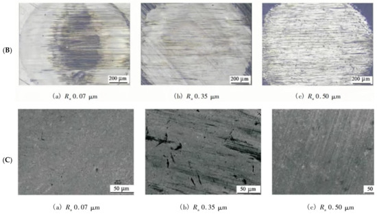 (A) SEM photographs of wear surface morphology: (a) N18, (b) N26, and (c) N41 [115]; (B) OM micrographs of the worn surface on the UHMWPE under water lubrication conditions; (C) SEM micrographs of the worn surface on the GCr15 steel ball with different roughness levels of the UHMWPE under water lubrication conditions [24].
