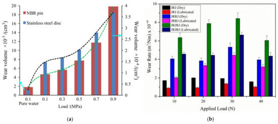 Another important factor affecting wear performance is the lubrication conditions. The common lubrication methods are water lubrication [24,25], oil lubrication [26,27,28], and grease lubrication [5]. As environmental pollution continues to increase, the green industry has become a global hot topic. The application of water, with its clean and environmentally friendly characteristics, is bound to become more and more widespread. Therefore, the study of the wear performance under water lubrication conditions has very important engineering applications and environmental significance.