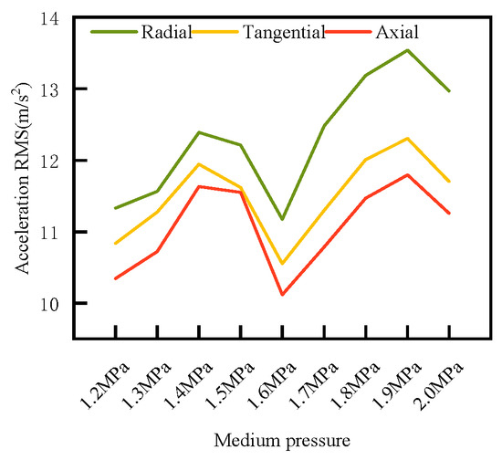 4.3. The RMS of the Face Vibration Acceleration Change Law with the Sealing Medium Pressure