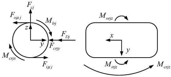 The differential equations of motion for rollers and cages, as well as the static equilibrium equation for the inner ring, are established in this section based on an analysis of the bearing’s movement, relative position, and mechanical relationship of its components [19,20,21]. Furthermore, specific expressions for the interaction forces between parts and the calculation process are provided.