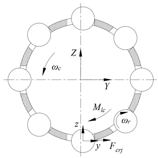 The bearing’s force state is shown in Figure 2. Assuming external forces on the inner ring, the displacement of the inner ring relative to the inertial coordinate system is denoted as .