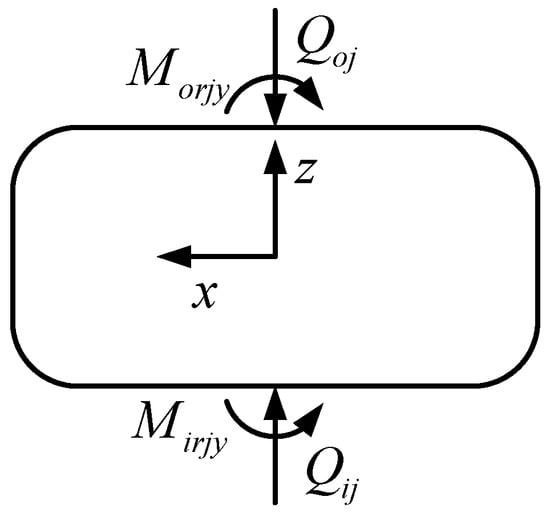 where and are the contact forces between the inner and outer raceways with the roller, is the centrifugal force on the roller, and and are the deflection torque of the inner and outer raceway to the direction of the roller around the y-axis.