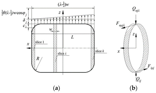 When the roller is divided into k slices along the generatrix direction, the deformation on each slice consists of three parts: deformation caused by radial load at position j, deformation caused by the convexity of the roller at , and deformation of the roller at position j caused by inner ring deflection, as shown in Figure 6a. The contact force between the roller slice and the inner and outer raceway is calculated using the Hertz contact theory, as shown in Figure 6b.