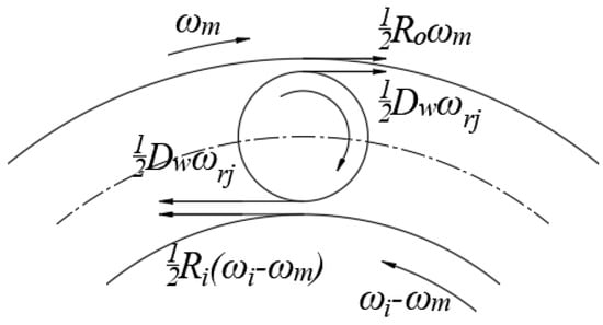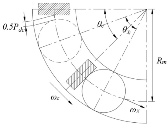 The slip velocity V is determined by the relationship shown in Figure 7, in which is the inner circle velocity, is the roller’s revolution velocity, and is the roller’s rotation velocity.