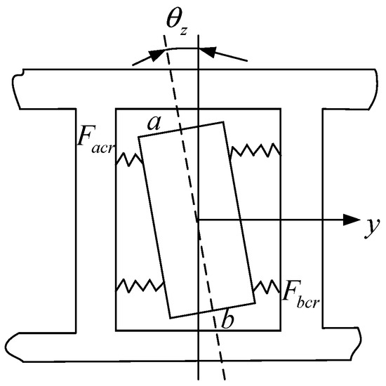 The roller pushes the cage forward in the bearing zone and the roller pushes forward in the non-bearing zone cage. The interaction between the roller and the cage is equivalent to a spring. Due to the gap in the pocket holes, the roller can only contact one side of the cage, which defines that the spring can only be compressed but not stretched. The compression amount of the spring is shown in Figure 8, where the dotted line represents the position of the roller when it is not in contact with the cage, and the solid line represents the position when the roller is in contact with the cage. In the figure, is the rotation angle of the roller and is the rotation angle of the cage.