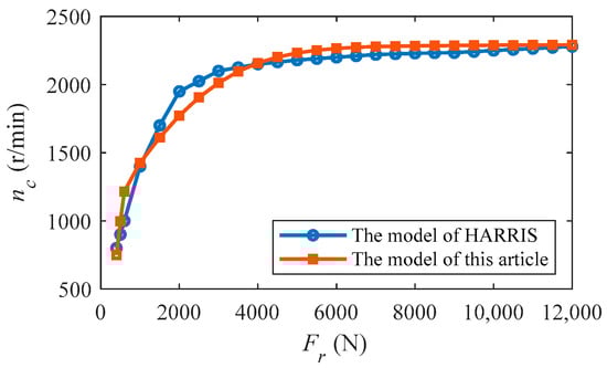 The bearing parameters specified in the Harris model [27] are incorporated into the aforementioned established model, and these parameters are presented in Table 1. By setting the inner ring speed of the bearing to 5000 r/min, we calculate the stable speed of the cage as the radial load varies from 0 to 12,000 N. The corresponding results are illustrated in Figure 11. It is observed that with an increase in radial load, there is a corresponding increase in cage speed until it reaches its maximum value, at which point it remains constant. These findings demonstrate a strong agreement between our proposed model and that of Harris, thereby validating the accuracy of our established model.