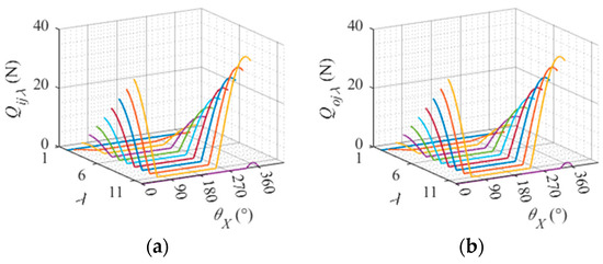 When the roller rotates once around the X-axis, the variation of contact force between each slice and raceway is shown in Figure 12, in which represents the rotation angle of the roller and denotes the section number of the roller along the direction of the generatrix. It is observed that the contact force between the roller and raceway changes with respect to the rotation angle. The maximum contact force occurs when the roller is positioned at the center of the bearing zone (). Specifically, this maximum contact force is present on slice 10 during rotations ranging from 0 to 90° and 270 to 360°. This is due to the linear contact between the roller and raceway, which results in a skewed ring when an unbalanced load is present. As a result, the contact force between the roller and raceway changes along the generatrix direction, leading to an asymmetrical load distribution that causes a large contact force at the heavy end and a small contact force at the light end. The maximum load of the roller along the generatrix bar occurs in slices located at both ends of the roller, with slice 10 experiencing maximum contact force between roller and raceway.
