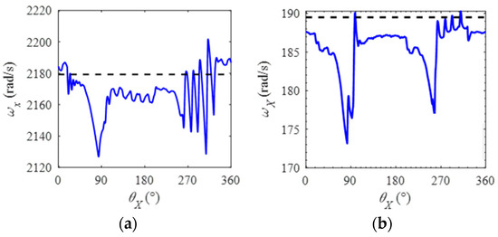 The variations in rotation speed and revolution speed of the rollers are depicted in Figure 13a,b. It can be observed that as the roller moves from the bearing region () towards the non-bearing region (), both rotation and revolution speeds initially remain stable before experiencing a sharp decline. Upon entering the non-bearing region, the rotational velocity and revolution velocity gradually increase to approach the theoretical level, exhibiting fluctuations within a certain range. During the transition from the non-bearing region () to the bearing region (), rotational velocity exhibits steady oscillations followed by a sudden decrease. Once inside the bearing zone, rotation speed rapidly rises to approximate and fluctuate around its theoretical value with a wide range of variation.