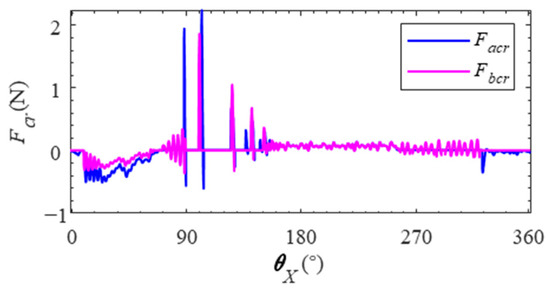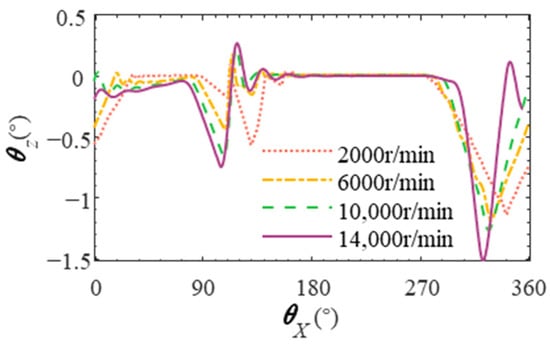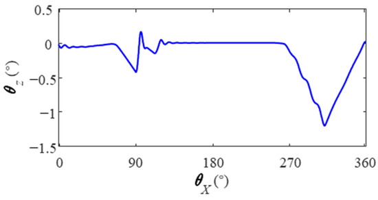 The variation of the roller’s skew angle around the z-axis is illustrated in Figure 14. The positive skew angle of the roller, defined as its counterclockwise rotation about the z-axis, exhibits a dependency on its revolution position. As the roller transitions from the loaded region to the non-loaded region, its skew angle remains minimal. However, upon approaching the non-loaded region, clockwise rotation around the z-axis leads to an increase in skew angle, whereas counterclockwise rotation results in a decrease after entering this region. Within the non-load region, clockwise rotation persists until reaching maximum value and stabilizing. Conversely, upon entering the loaded region again, counterclockwise rotation causes an increase in skew angle.