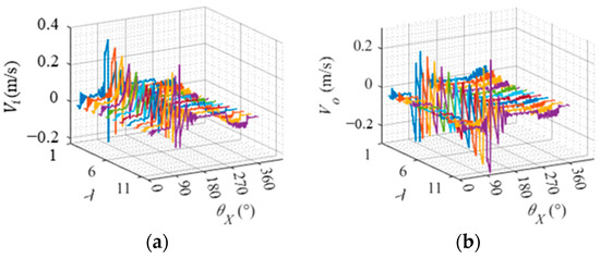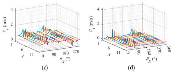 To further investigate the causes of changes in roller rotation and revolution speed, a plot is presented in Figure 15 illustrating the relative sliding speed of each slice of a single roller over a rotation cycle with the inner and outer raceways. Overall, as the roller transitions from the loaded region () to the non-loaded region (), its relative sliding speed with both raceways initially exhibits steady fluctuations followed by gradual increments. Upon entering the non-loaded region, this relative sliding speed decreases and fluctuates within a specific range.
